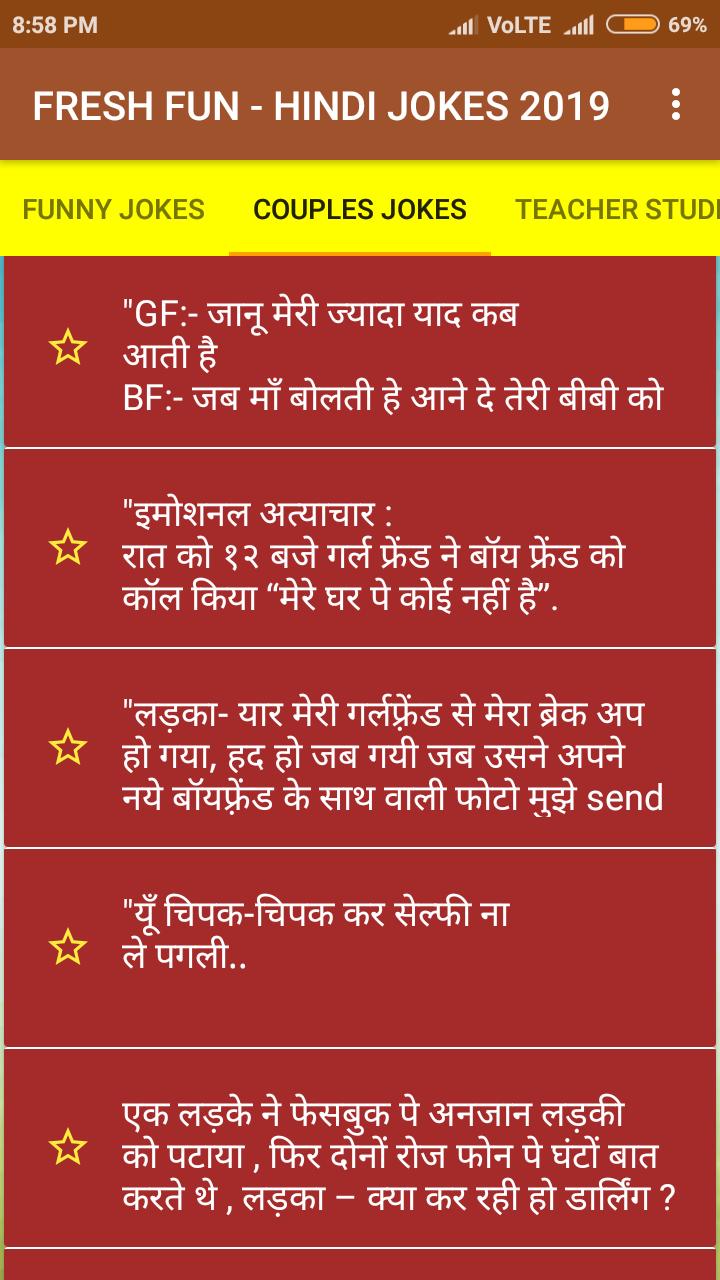 Categories punjabi chutkule, punjabi jokes tags punjabi chutkule, punjabi chutkule 2021, punjabi chutkule in english, punjabi funny chutkule, punjabi jokes chutkule ਜਨਾਬ ਕੱਲ ਰਾਤ ਸਾਰੇ ਕੈਦੀਆਂ ਨੇ ਜੇਲ ਚ ਰਾਮ ਲੀਲਾ ਕੀਤੀ ਸੀ. औरत क ख श करन funny hindi jokes jokescoff. Jokes happy easter funny quotes; Funny bf gf loveyou missyou lovers girlfriend boyfriend. Mujhse wada karo key tum mujhe touch karne aur kiss karne ko force nahi karoge! Next article gf bf jokes in hindi language | girlfriend boyfriend jokes in hindi | funny boyfriend girlfriend conversations | bf gf jokes | unclejokes; रहें हर खबर से अपडेट, डाउनलोड करें android hindi news app, ios hindi news app और amarujala hindi news app अपने मोबाइल पे| get all latest funny jokes in hindi related to hindi chutkule, husband wife jokes, whatsapp jokes, chutkule in hindi, hindi funny jokes and love sms etc. Jokes funny work from home pics; Jokes funny word of the day; September 17, 2019 by admin. Jokes funny sleeping status for whatsapp; Funny girlfriend quotes in hindi image quotes at relatably com. Read more heart touching love quotes in hindi 2021.